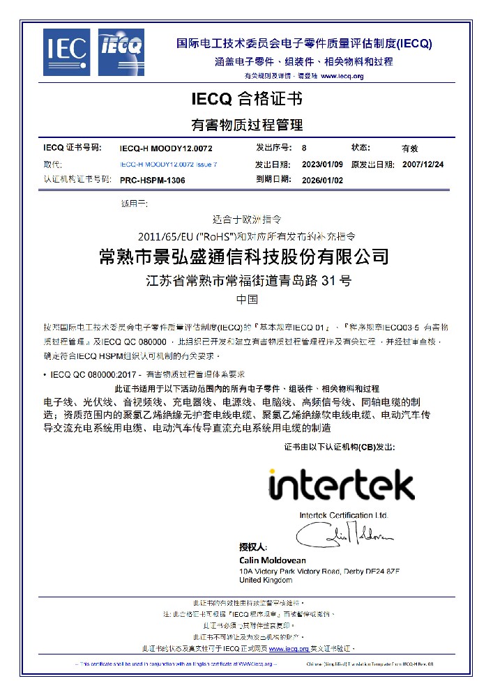 有害物質(zhì)過(guò)程管理體系證書
